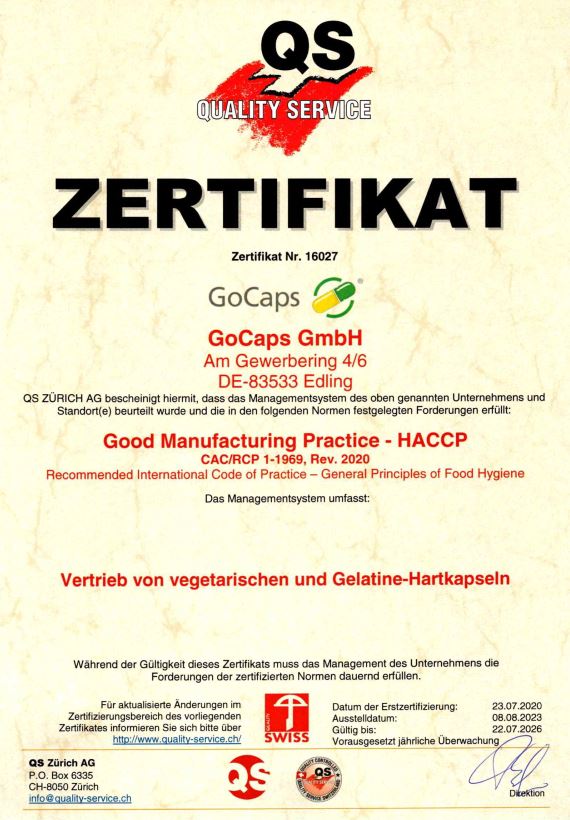 Eine gute Herstellungspraxis nach Lebensmittelstandard / Codex Alimentarius und die Einhaltung aller lebensmittelrechtlichen Vorgaben wird ebenfalls jährlich durch eine unabhängige Zertifizierungsgesellschaft geprüft. Die europäischen Richtlinien für eine Gute Herstellungspraxis dienen der Qualitätssicherung bei der Produktion von Produkten, die ein mögliches Gesundheitsrisiko für den Menschen darstellen.